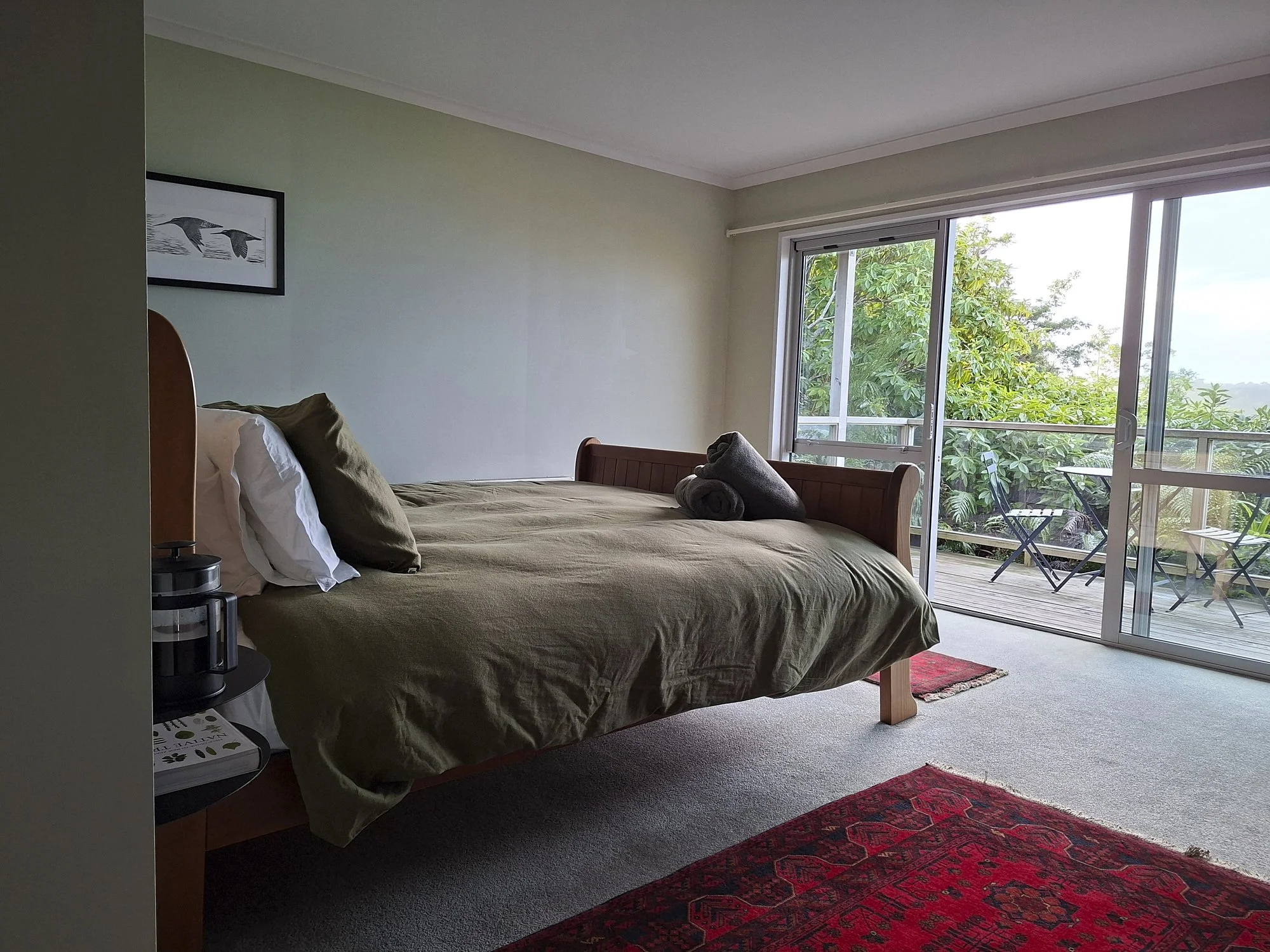 The room features a king bed, quality bed linen, a private bathroom, and double doors that open onto the deck: with an impressive view stretching across to the tranquil shores of Butterfield Beach.